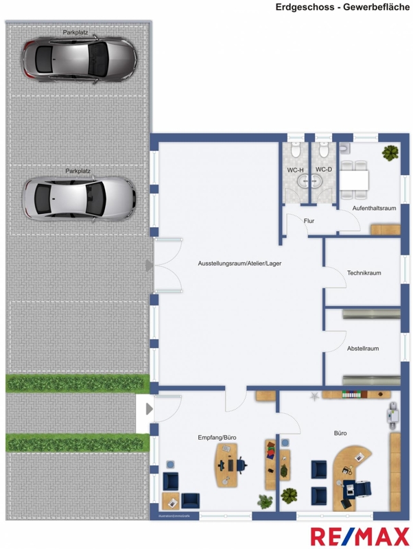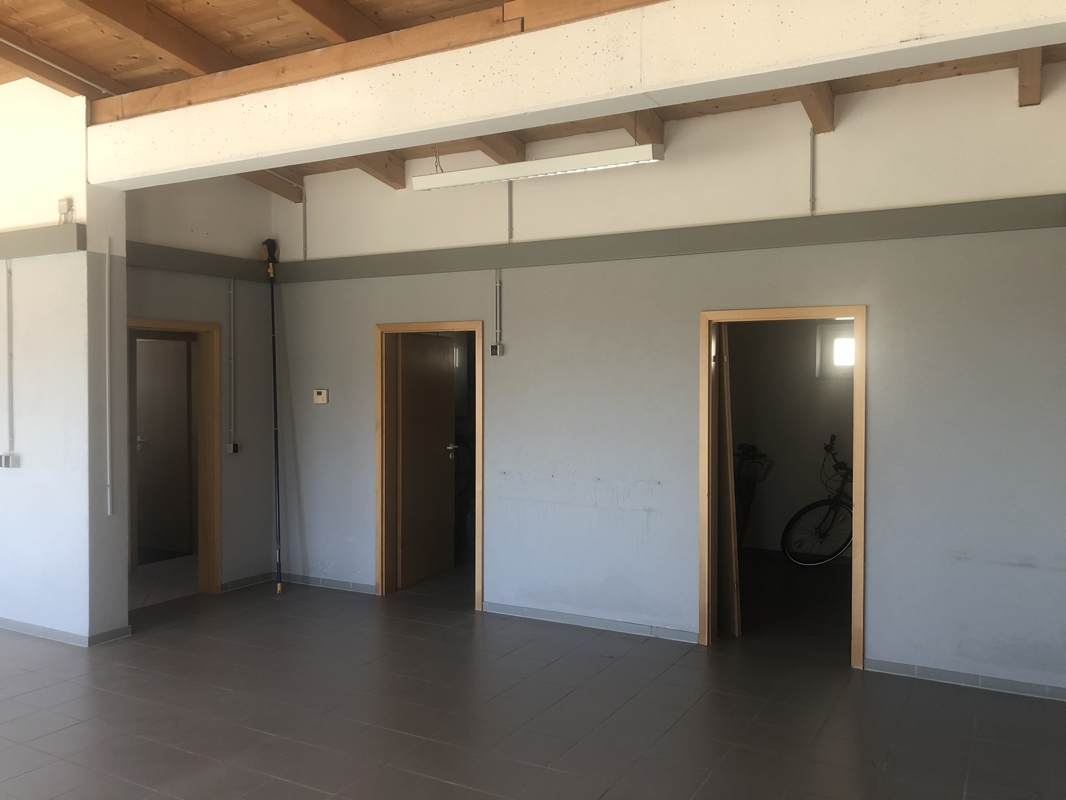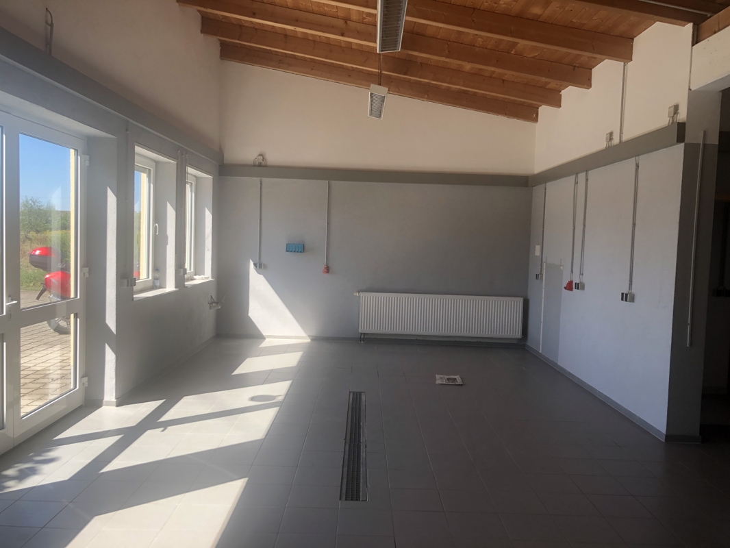 Die Fläche mit knapp 124 m² verteilt sich auf: Empfang, Büro, Technikraum, Abstellraum, Aufenthaltsraum, lichtdurchflutete Halle, Sanitäre Einrichtungen. Diese bestehen aus zwei WC-Kabinen mit Waschbecken. Nutzbar als Kunden WC und Mitarbeiter WC.