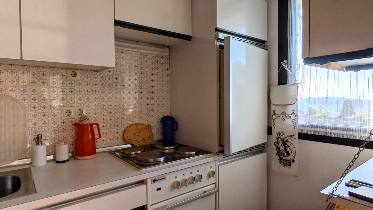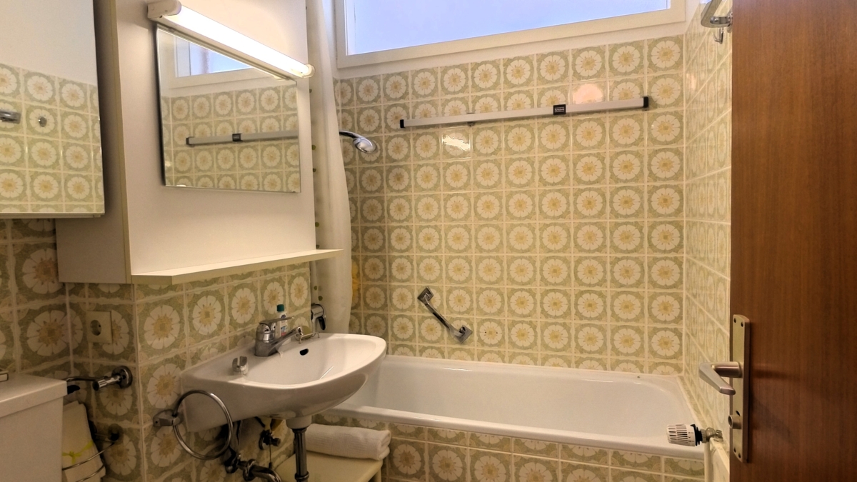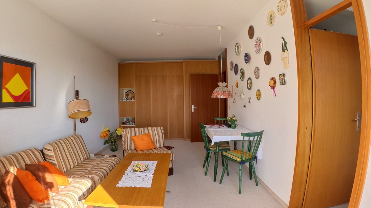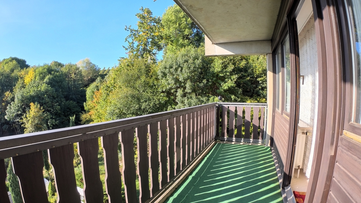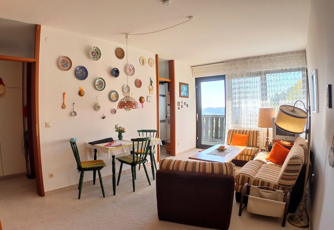 Die Wohnung selbst präsentiert sich in einem gepflegten Zustand. Große Fenster sorgen für eine helle und freundliche Atmosphäre und bieten einen wunderbaren Blick auf die umliegende Natur.