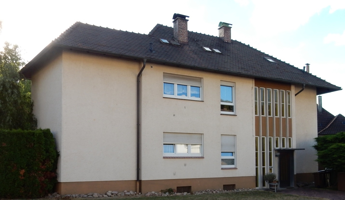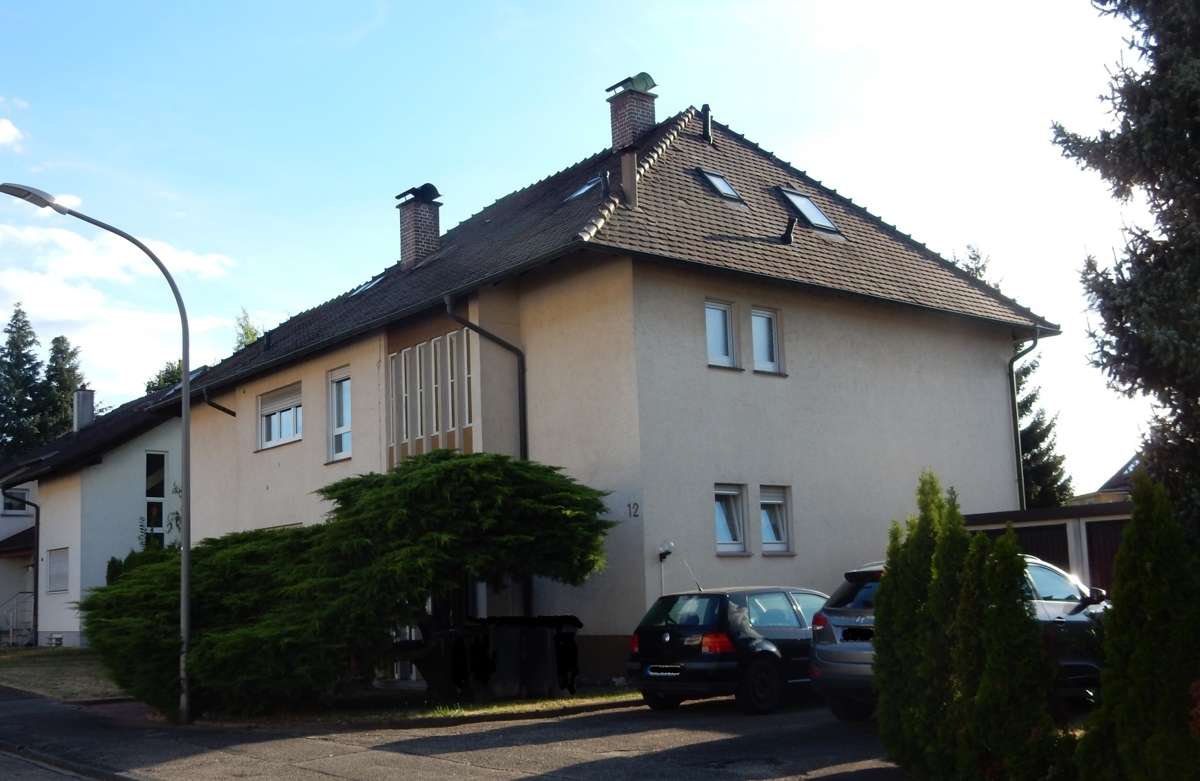 Das 1957 erbaute Haus mit 773 m² großem Grundstück besitzt einen schönen Garten.Das zweigeschossige, unterkellerte Haus mit ausgebautem Dachgeschoss in massivbauweise besteht aus einer Erdgeschosswohnung mit Terrasse und Balkon, einer Obergeschosswohnung mit zwei Balkonen und einer Dachgeschosswohnung mit einer Gaube.