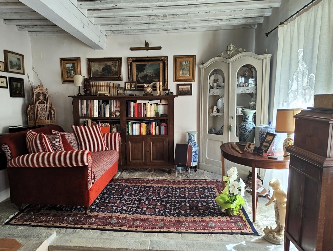 Im Erdgeschoss geht man von der Küche in das Esszimmer und zur Gästetoilette, von hier aus geht es weiter in das große Wohnzimmer mit Kamin (mit Glastüre), der älteste Teil des Hauses. Das Wohnzimmer hat einen direkten Zugang zur Panoramaterrasse und zum oberen Stockwerk.