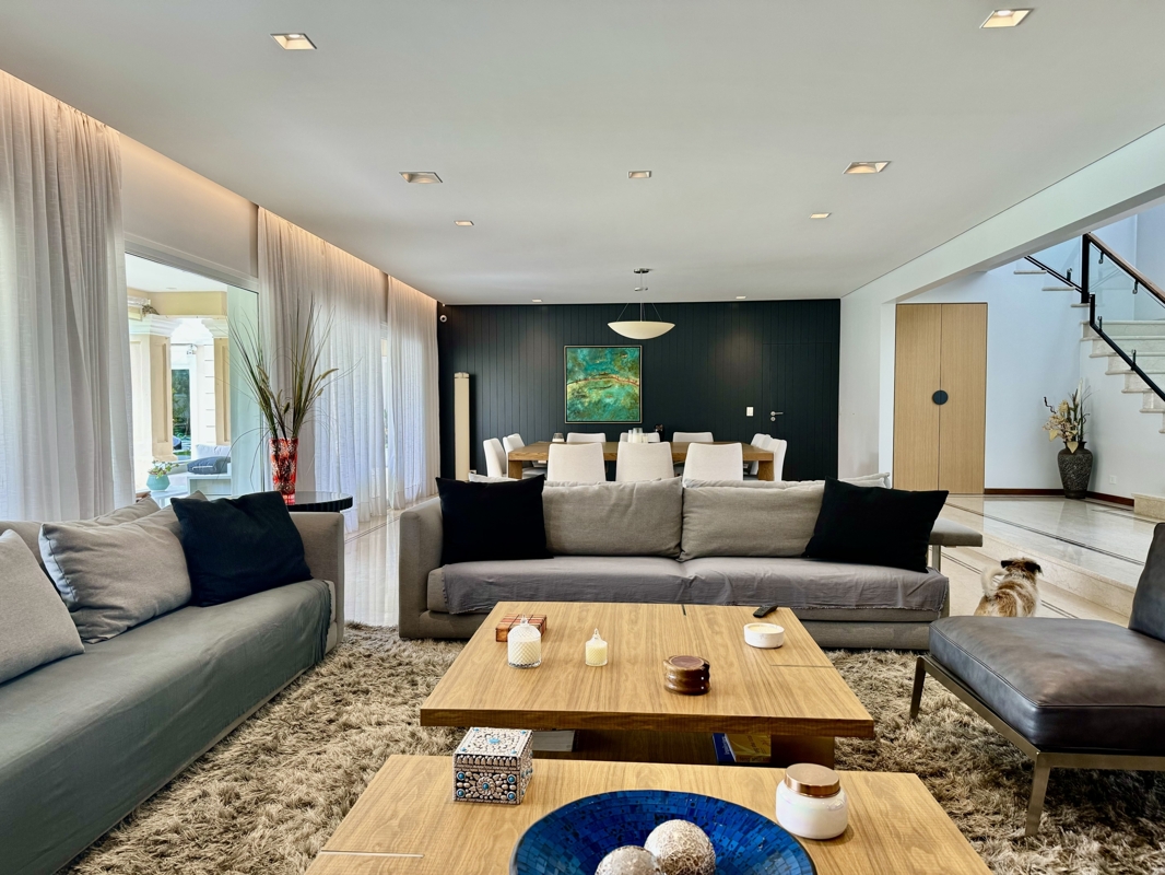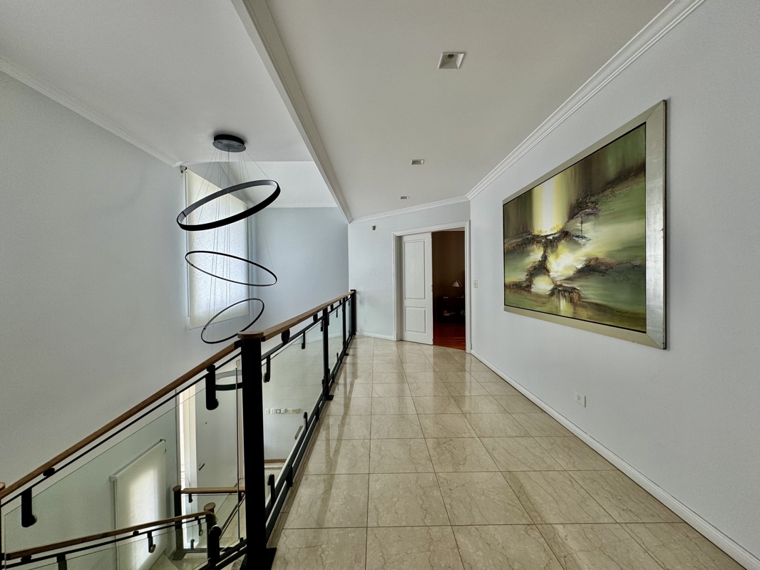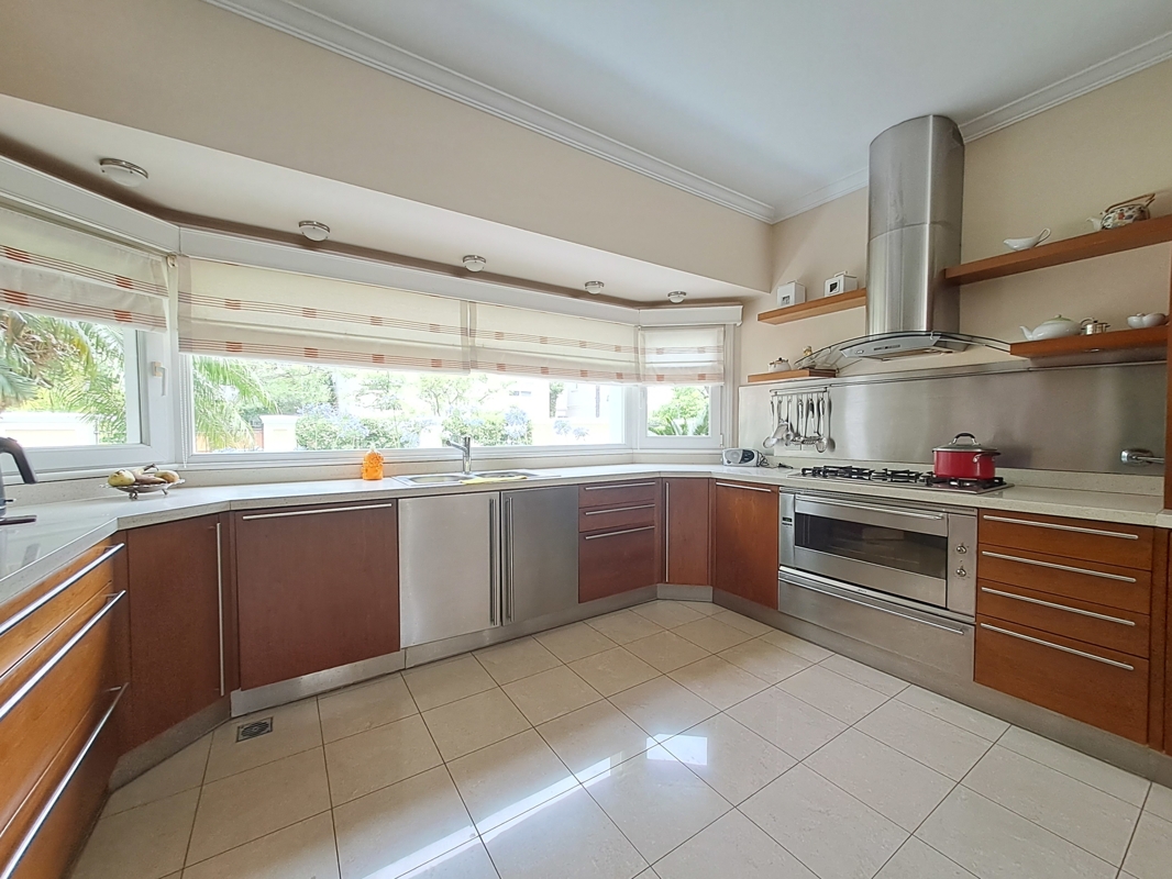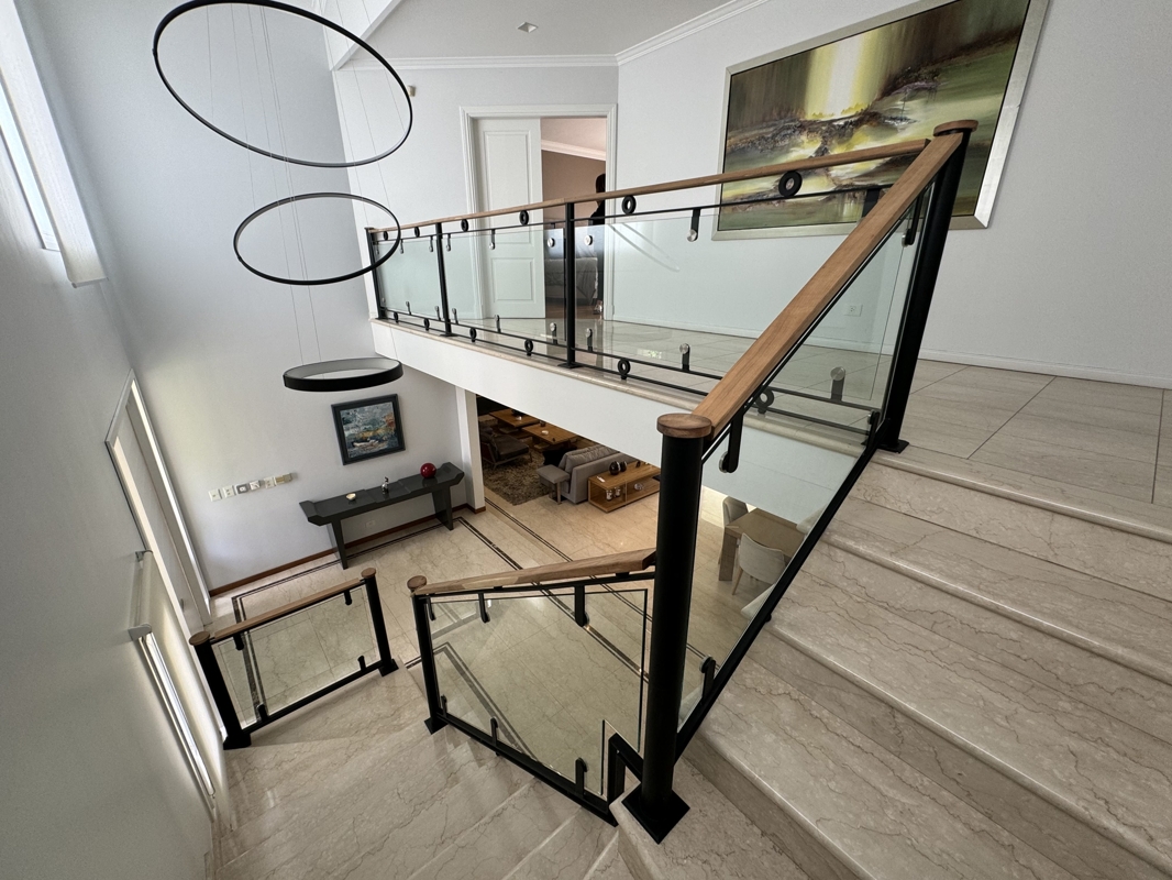 Beim Betreten werden Sie von geräumigen, lichtdurchfluteten Räumen begrüßt, die von einem wunderschön gestalteten Garten umgeben sind. Die Villa ist mit hochwertigen Details ausgestattet, darunter Marmorböden, eine majestätische Treppe und ein Empfangsbereich mit riesigen Fenstern, die den Blick auf die Galerie und den Garten freigeben.