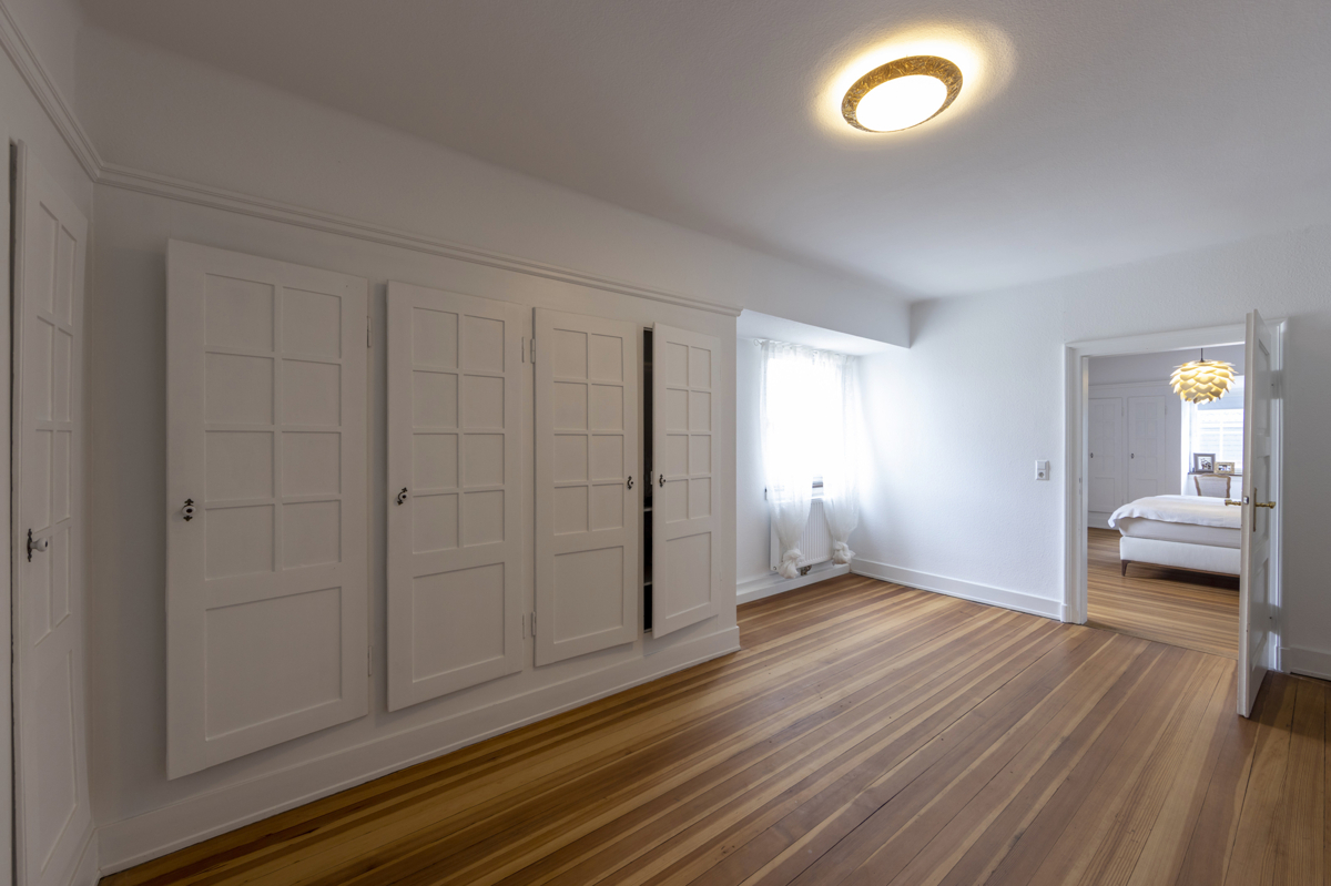 Betritt man die Immobilie, wird man von einer gemütlichen, eingebauten Sitzecke aus Holz im Eingangsbereich empfangen. Ein handbemalter Wandabschnitt wurde geschickt in das moderne Raumkonzept integriert. Nischen mit weißen Holzwänden, ein antiker Kachelofen sowie hochwertige Pitch Pine Dielen unterstreichen den individuellen Charakter dieser Räume.