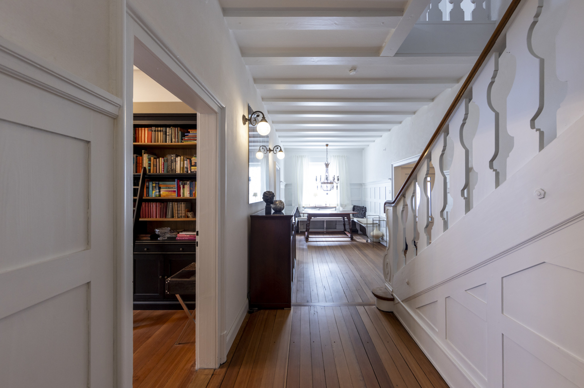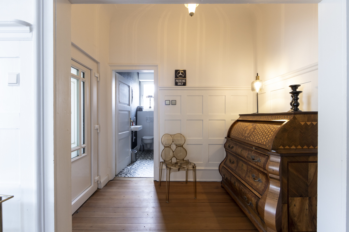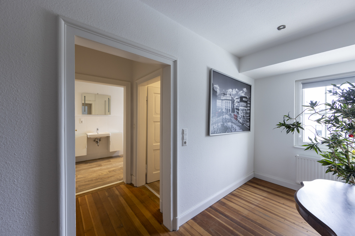Betritt man die Immobilie, wird man von einer gemütlichen, eingebauten Sitzecke aus Holz im Eingangsbereich empfangen. Ein handbemalter Wandabschnitt wurde geschickt in das moderne Raumkonzept integriert. Nischen mit weißen Holzwänden, ein antiker Kachelofen sowie hochwertige Pitch Pine Dielen unterstreichen den individuellen Charakter dieser Räume.