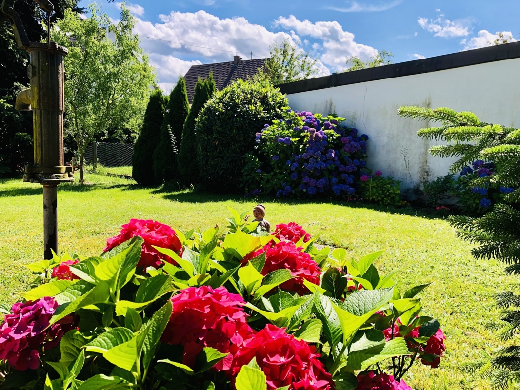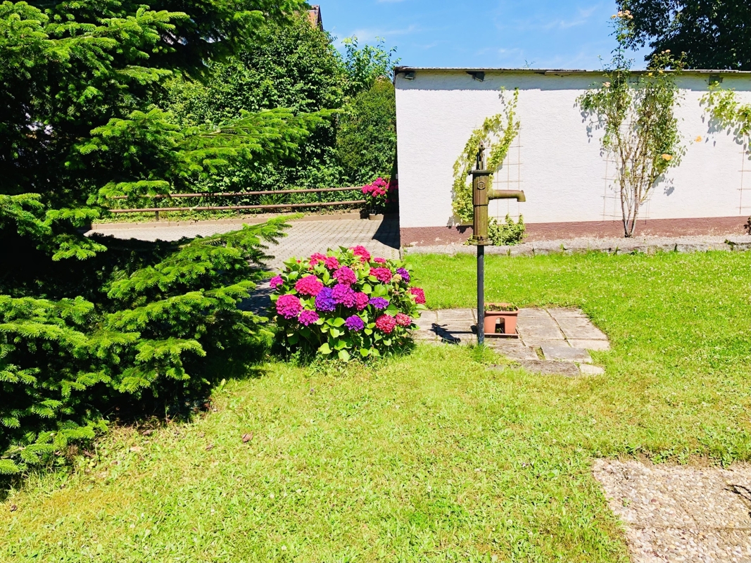 Auf dem Grundstück befinden sich zudem zwei Garagen und ein weiterer Stellplatz im Freien. Im Garten lädt eine Sitzecke zum Verweilen ein. Hinter den Garagen befindet sich ein Gerätehaus für Gartenutensilien.