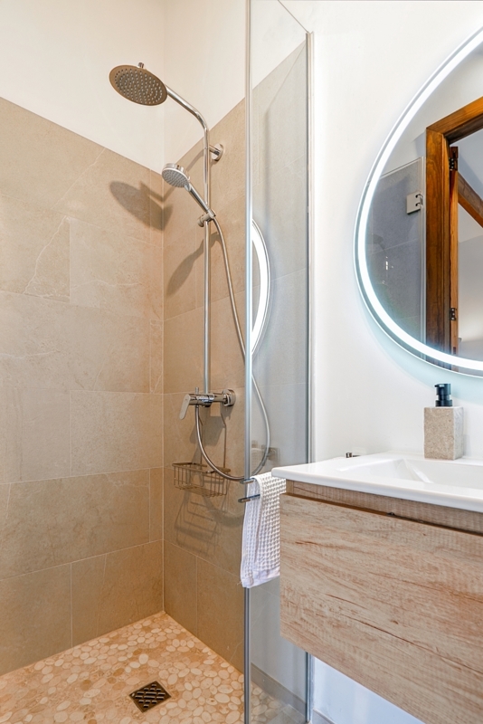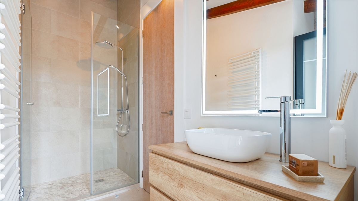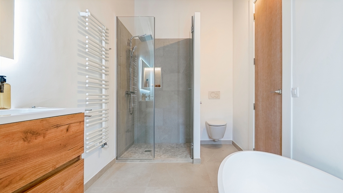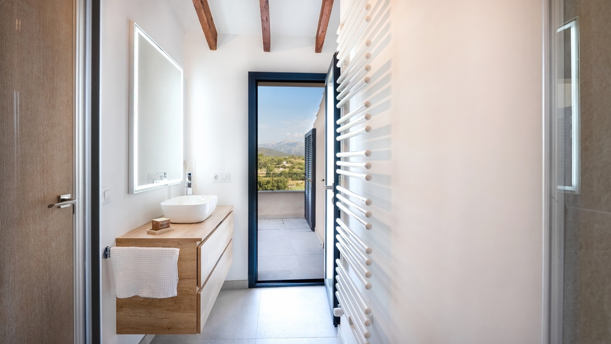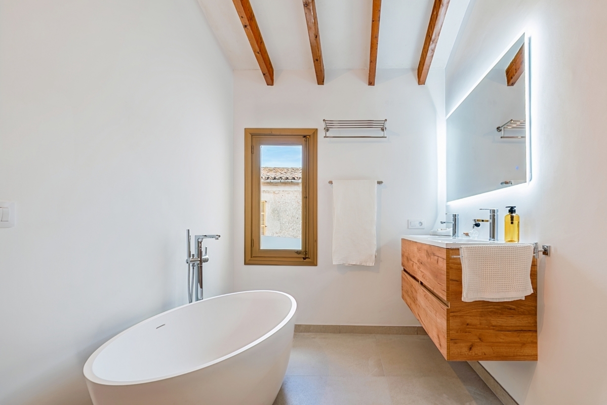 Auf der linken Seite befindet sich das Hauptschlafzimmer mit einem mallorquinischen Holzbett. Dieses Badezimmer verfügt über ein Doppelwaschbecken, eine freistehende Badewanne und eine Dusche mit eleganter Nische für Ihr persönliches Wellnessprogramm.