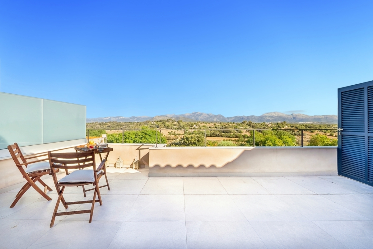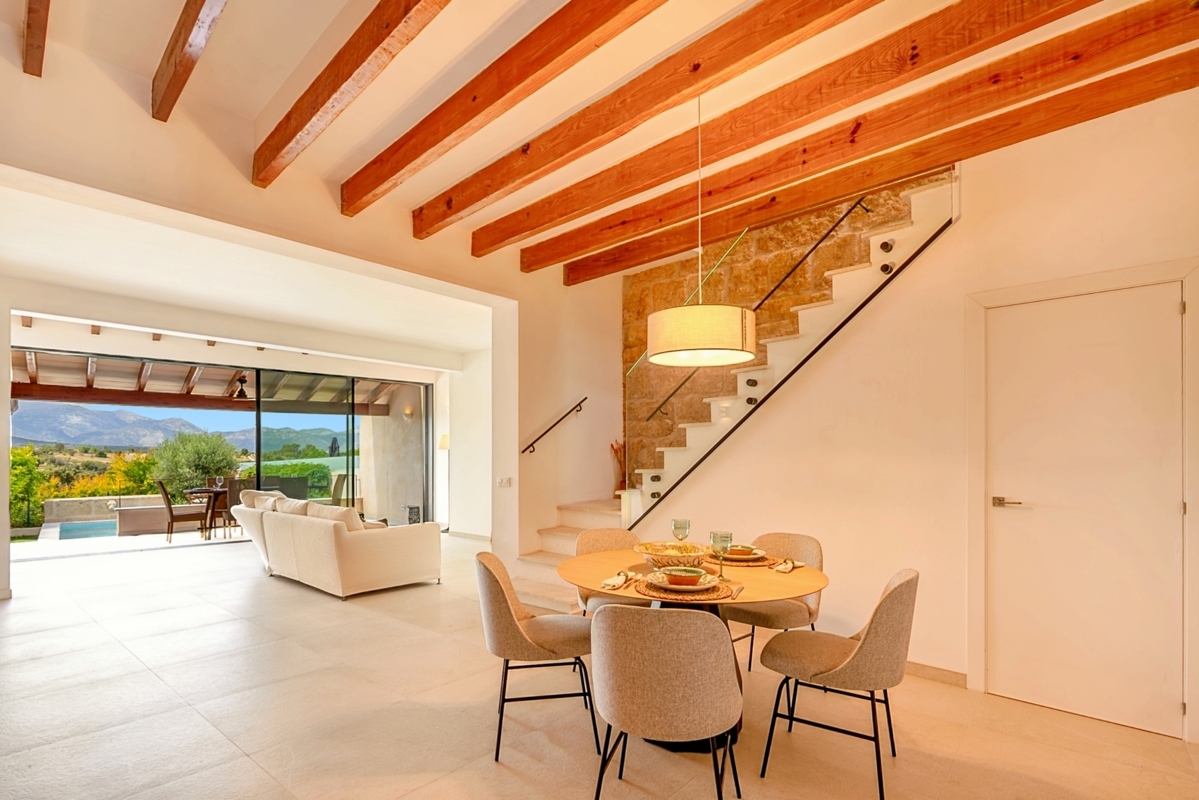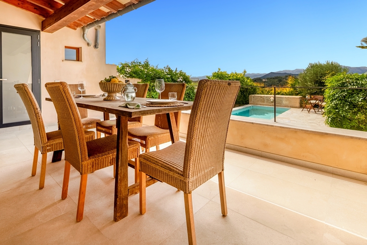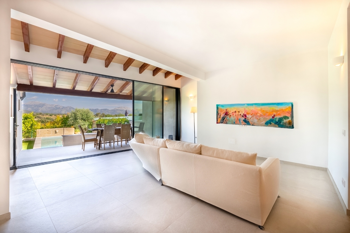 Sie und Ihre Gäste können auch auf dem Sofa oder am großen Tisch auf der Terrasse zusammensitzen. Die Rahmen der Schiebetüren rahmen den wunderbaren Blick auf die Tramontana wie ein großes Gemälde in Ihrem Wohnzimmer ein.