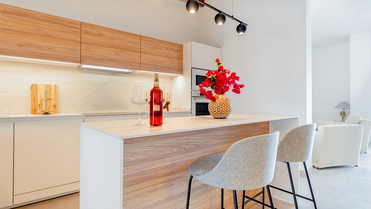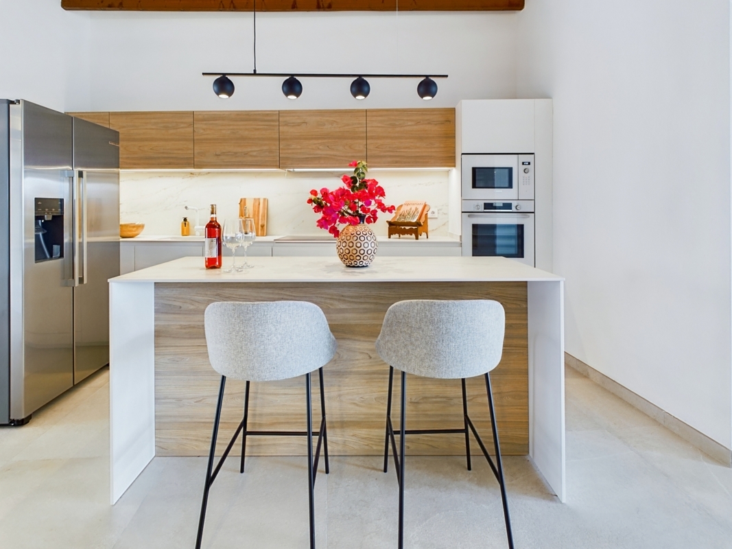Auf der linken Seite können Sie in Ihrer Designerküche nach Herzenslust kochen. Das spanische Design des renommierten Küchenherstellers Santos wird mit den integrierten Geräten der deutschen Marke BOSCH kombiniert. Der amerikanische Kühlschrank bietet ausreichend Platz, um auf dem Wochenmarkt einzukaufen.