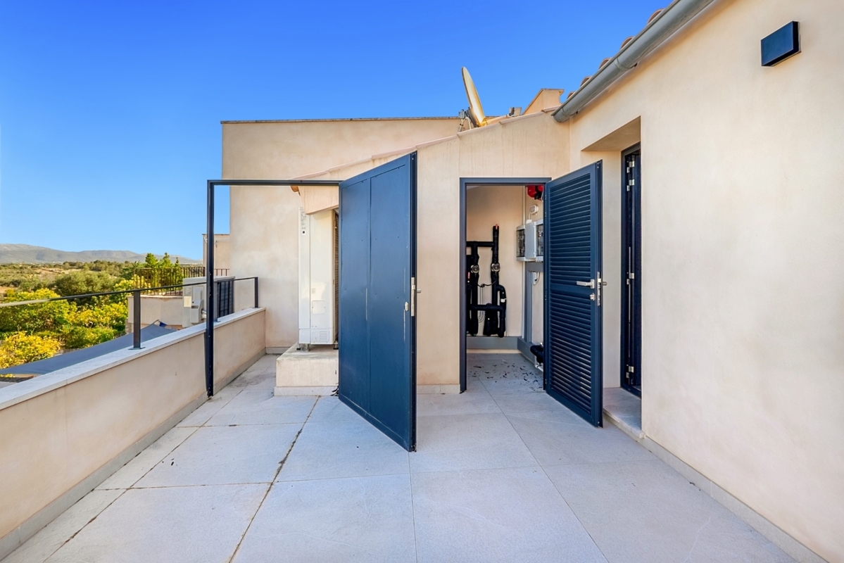 Auf der oberen Terrasse, versteckt hinter zwei grauen Türen, befindet sich die Wärmepumpe und daneben der Technikraum. Die Solaranlage und die Fußbodenheizung unterstützen einen energiebewussten Lebensstil; Übrig gebliebener Strom kann ins Netz zurückgespeist und vergütet werden. Alle Räume im Haus können zentral und individuell temperiert werden. Die Pooltechnik befindet sich im hinteren Bereich. Dort ist auch die Wasserenthärtungsanlage für das ganze Haus installiert.