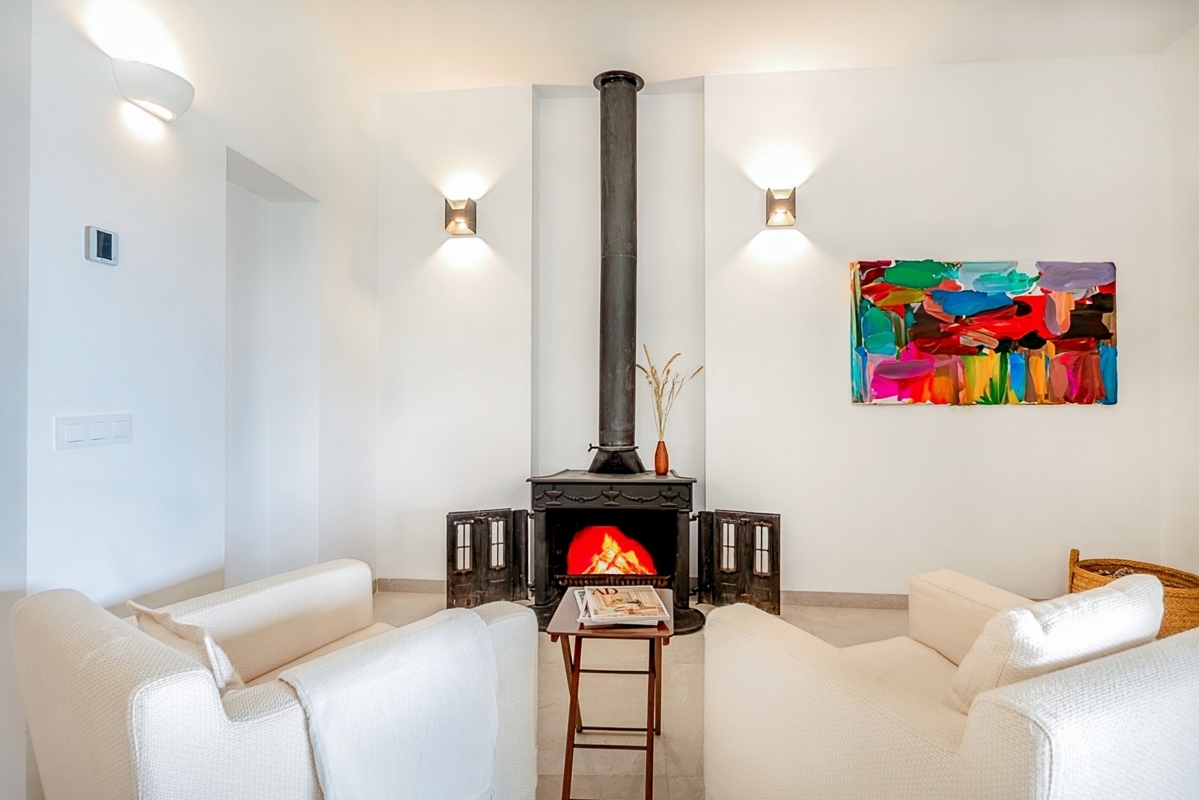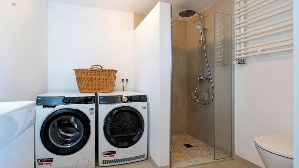 Am eigenen Kamin können Sie bei knisterndem Feuer in einem guten Buch verweilen oder einen romantischen Abend mit Ihrem Partner verbringen. Im Erdgeschoss befindet sich ein weiteres Badezimmer mit Dusche und AEG-Waschmaschine und Trockner in deutscher Markenqualität.