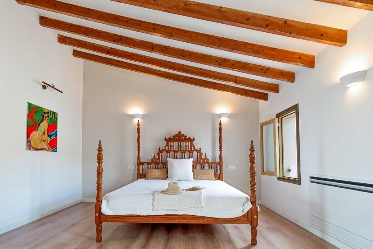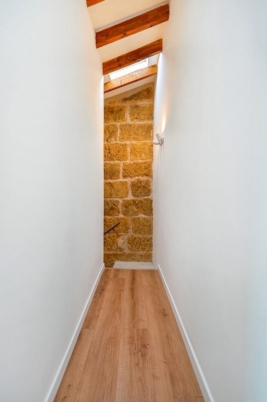 Vom Wohnzimmer aus gelangt man in den ersten Stock. Das Highlight hier ist die original mallorquinische Natursteinmauer und der hochwertige Parkettboden. Extra hohe Eichentüren, die im ganzen Haus installiert sind, führen links und rechts zu den beiden Schlafzimmern auf dieser Etage.