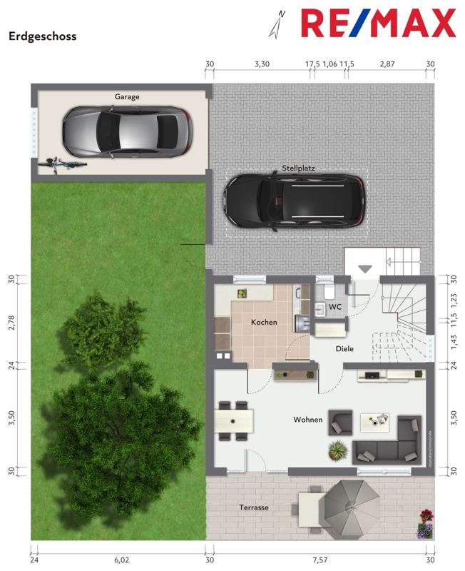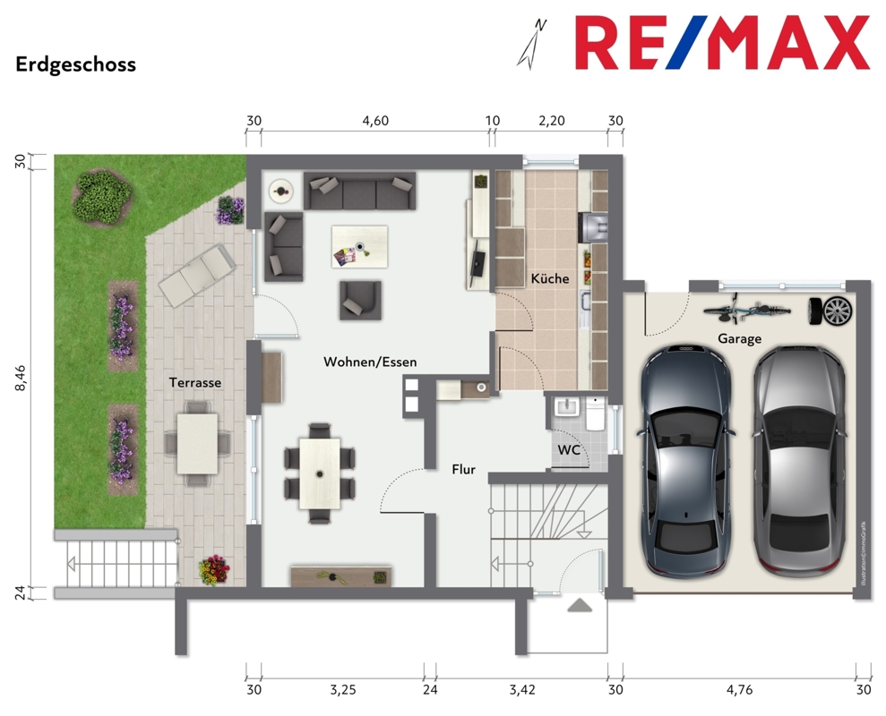 Erdgeschoss - offener Wohn/Essbereich mit Zugang auf die Terrasse und Garten, Küche, Flur, Gäste WC.