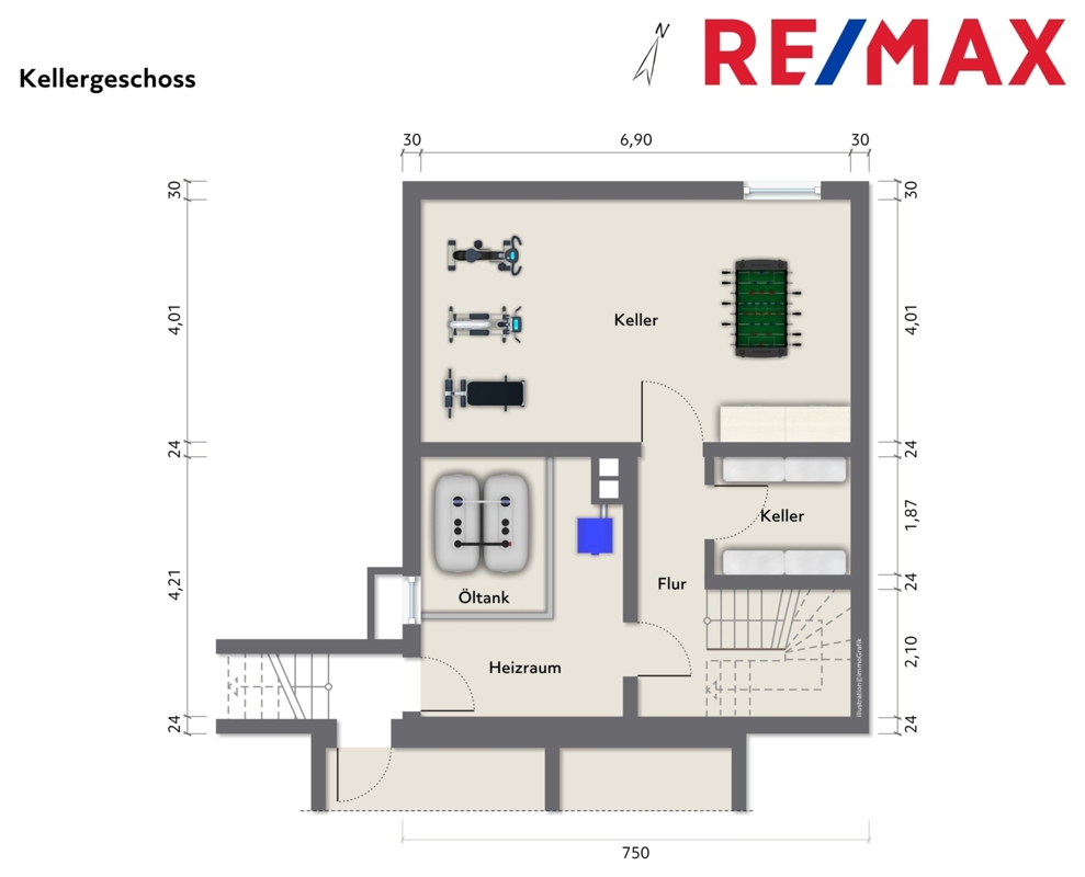 Das Kellergeschoss umfasst 2 Kellerräume sowie einen Heizraum.