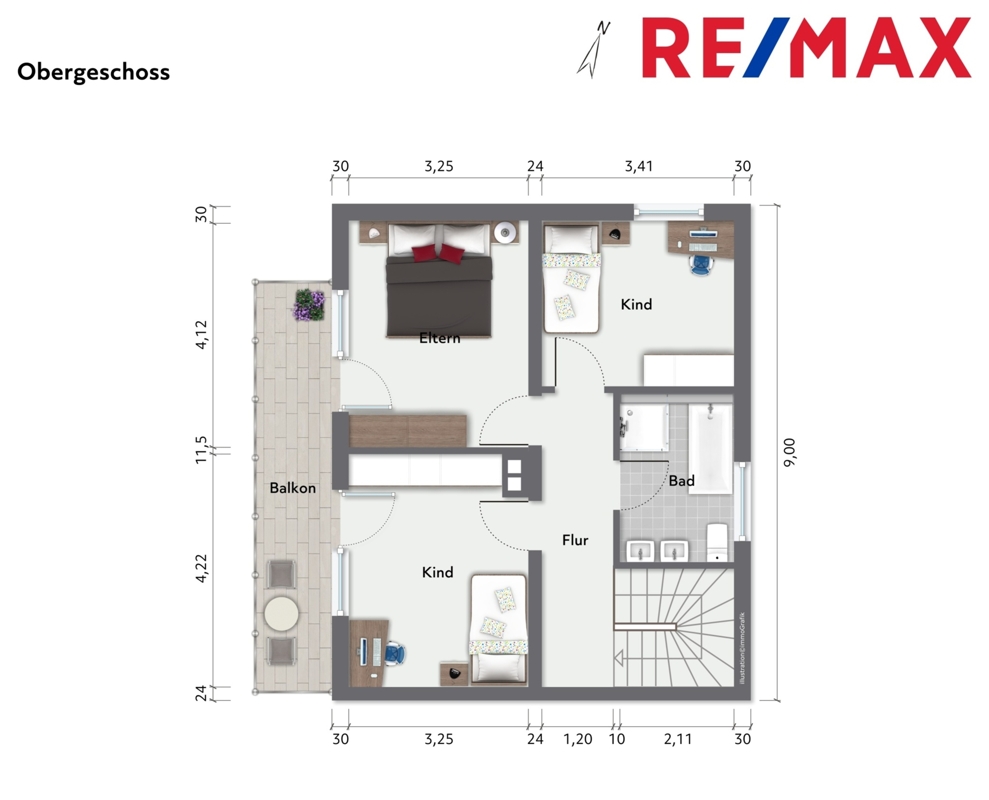 Im OG befinden sich 3 Schlafzimmer, Tageslichtbad mit Dusche und Badewanne.