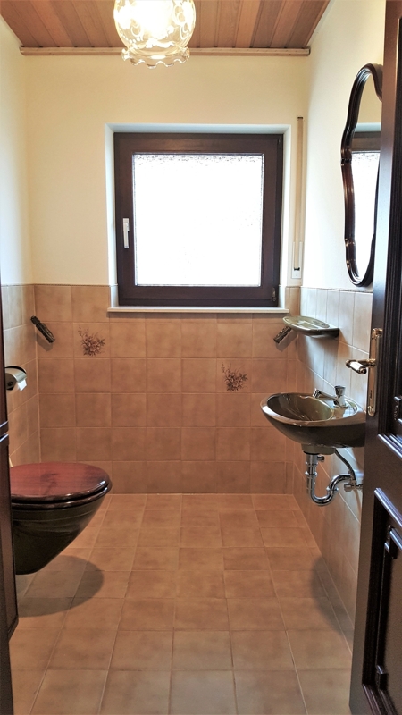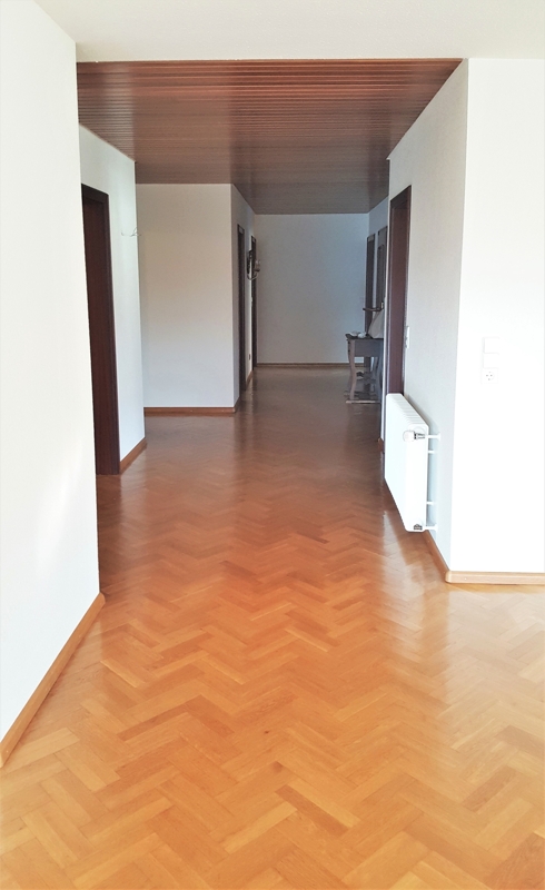- Parkettboden in Flur, Wohn- und Esszimmer sowie im Schlafzimmer.- Fliesenboden in Küche, Bad und WC