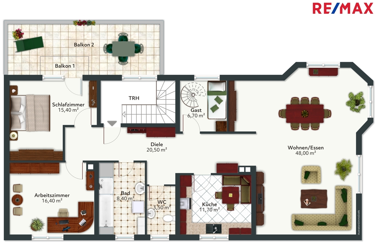 Vom Schlafzimmer aus kommen Sie über den kleinen auf den neu gebauten großen Balkon (ca. 7 m x 2,70 m), mit ausreichend Platz für Loungemöbel und eine grüne Oase.