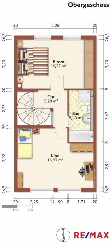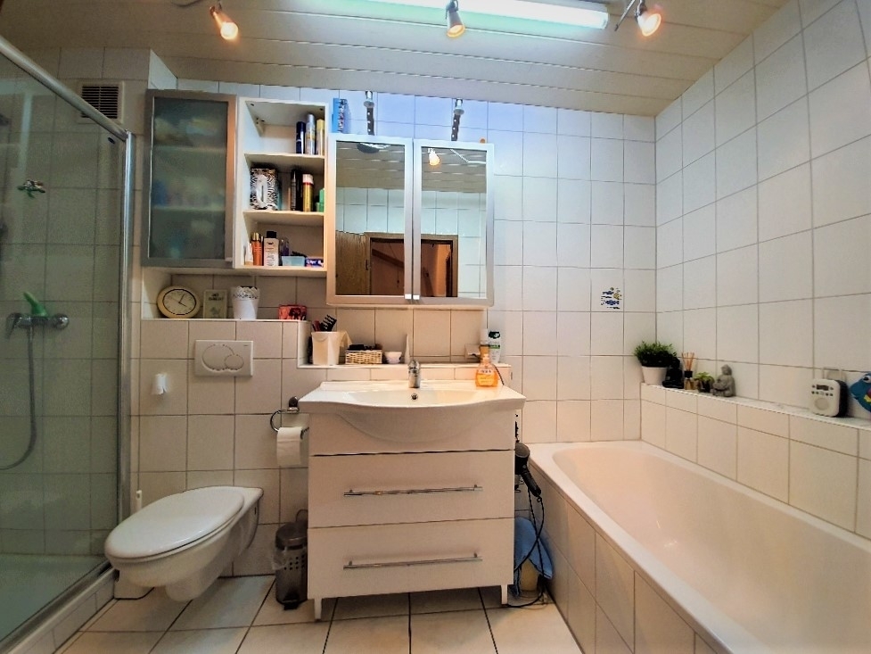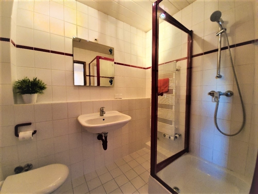 Im Obergeschoss stehen Ihnen ein Badezimmer mit Dusche und Wanne zur Verfügung sowie zwei große Schlafzimmer, eines davon mit bodentiefen Fenstern.