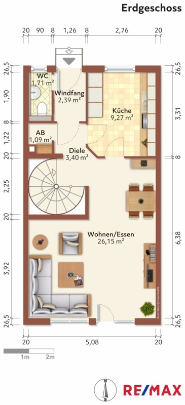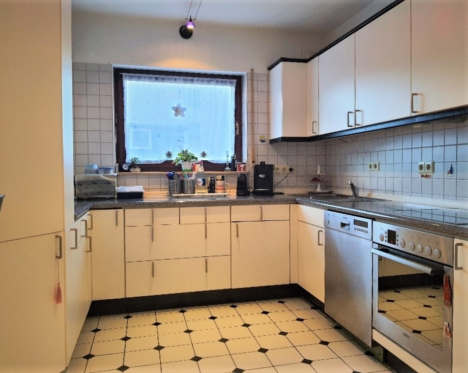 Die geräumige und komplett ausgestattete Küche und das Gäste-WC befinden sich ebenfalls im Erdgeschoss.