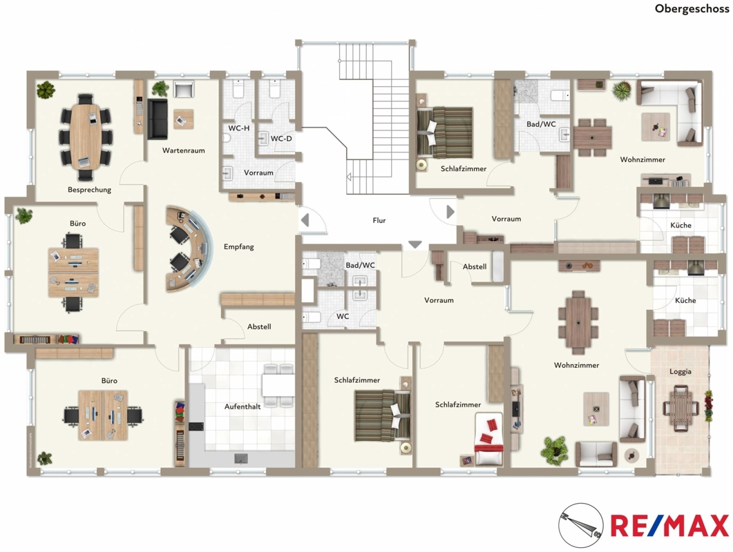 Im Obergeschoss befindet sich eine Wohnung (z.B. für Geschäftsführer) sowie weitere gewerbliche Flächen, die z. B. als Büros, Präsentations- oder Aufenthaltsräume genutzt werden können.