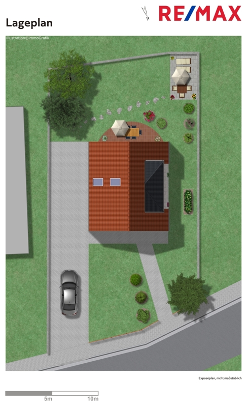 Die gesamte Außenanlage, vom Eingangsbereich bis hin zum gemütlichen Freisitz, ist in der Formensprache, Material- und Pflanzenauswahl, im Sinne eines geschmackvollen Bauerngarten arrangiert.