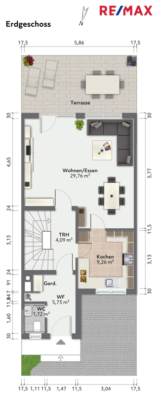 Erdgeschoss = 57,23 m² Wohnfläche (inkl. Terrasse 4,50 x 2,80 m, laut Wohnflächenberechnung)