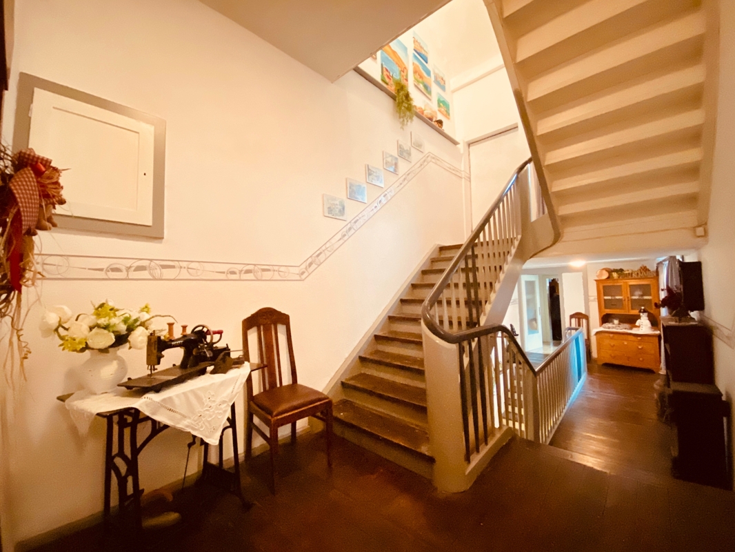 Lichtdurchflutete Räume, offene Balken, hohe Decken, wunderschöne Kassettentüren aus Holz, eine geschwungene breite Holztreppe, welche die Etagen des Haupthauses verbindet. Alle diese Elemente erzählen die Geschichte einer vergangener Zeit .